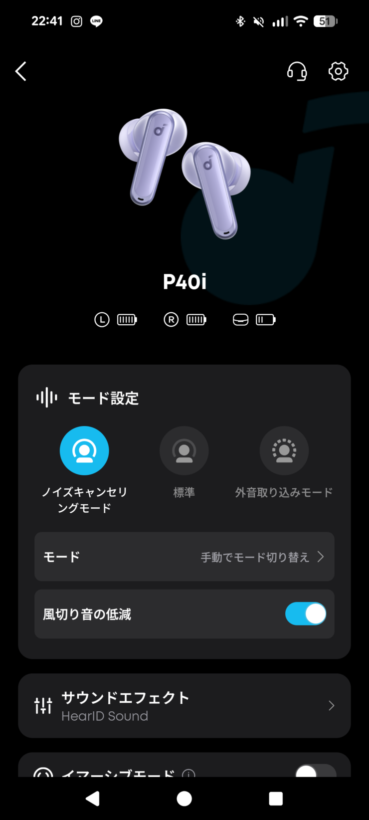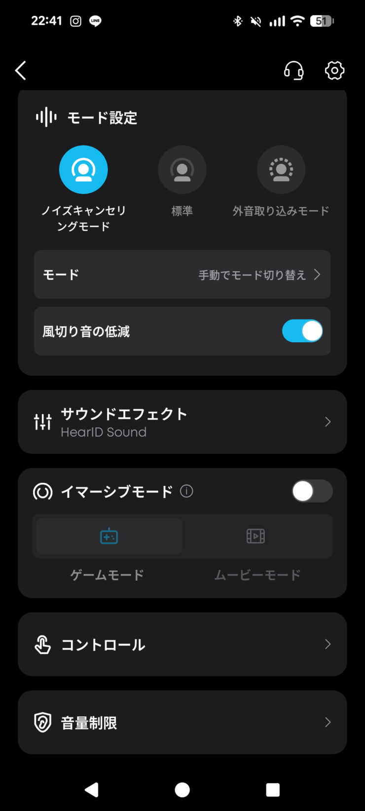 通常のノイキャンや外音取り込みモードは切り替え設定もアプリからできますが、イマーシブモードは切り替えできないんです。